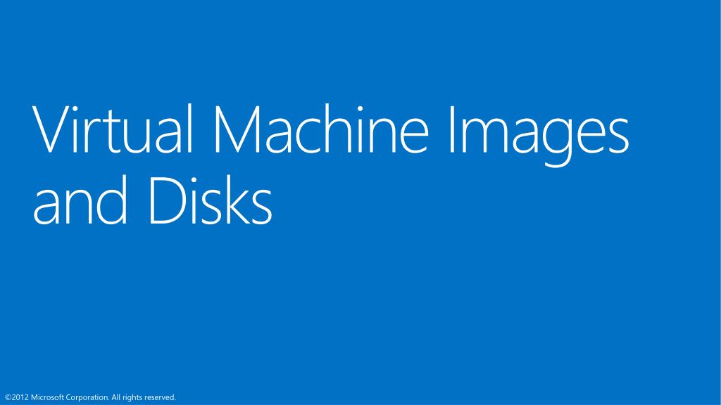 Images and Disks OS Images Microsoft Partner User Base OS image for new Virtual Machines Sys-Prepped/Generalized/Read Only Created by uploading or by capture Disks OS Disks Data Disks Writable Disks for Virtual Machines Created during VM creation or during upload of existing VHDs.