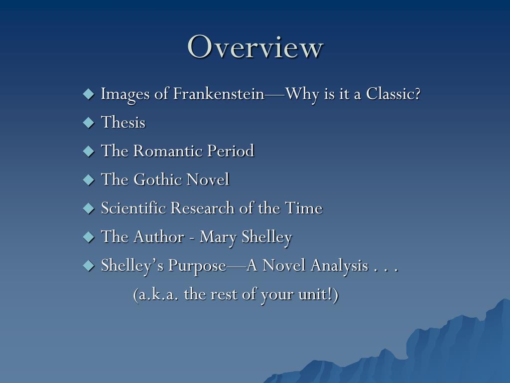 Overview • Images of Frankenstein—Why is it a Classic? • Thesis • The Romantic Period • The Gothic Novel • Scientific Research of the Time • The Author - Mary Shelley • Shelley’s Purpose—A Novel Analysis . . . (a.k.a. the rest of your unit!)