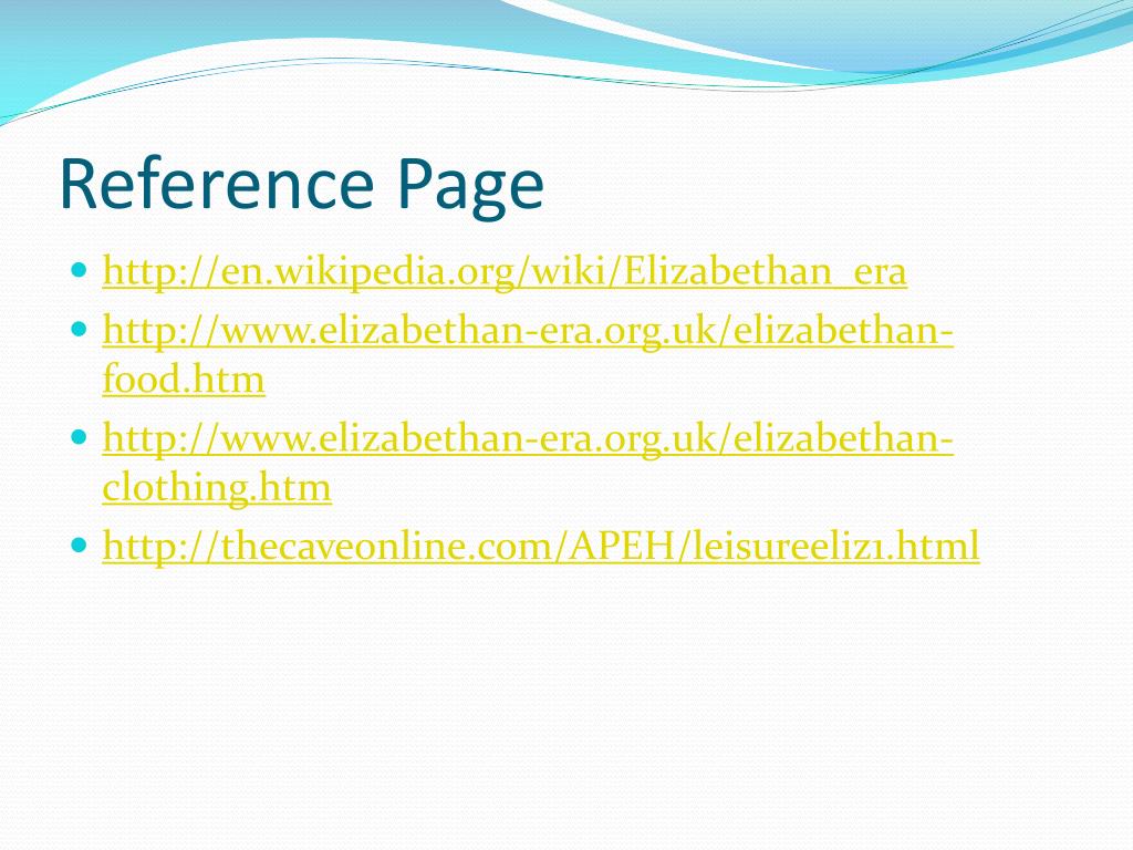 Reference Page • http://en.wikipedia.org/wiki/Elizabethan_era • http://www.elizabethan-era.org.uk/elizabethan-food.htm • http://www.elizabethan-era.org.uk/elizabethan-clothing.htm • http://thecaveonline.com/APEH/leisureeliz1.html