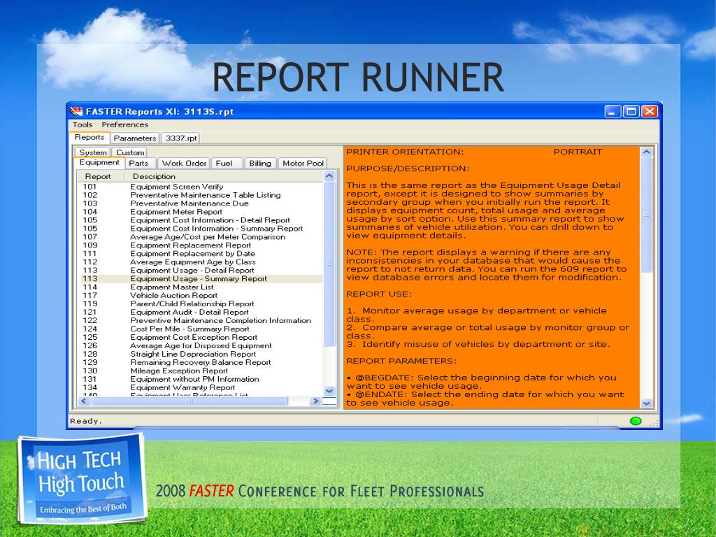 Do you use the FASTER reports? • Do you use the reports to monitor your processes? If not why? • Does everyone have the newest RRXI Version 2.1.1.5? • 117 Standard & 8 Motor Pool • Why do I need to use the reports? • What do you do with the reports? • How do you share the results?