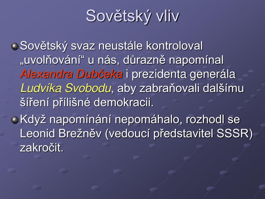 Sovětský vliv • Sovětský svaz neustále kontroloval „uvolňování“ u nás, důrazně napomínal Alexandra Dubčeka i prezidenta generála Ludvíka Svobodu, aby zabraňovali dalšímu šíření přílišné demokracii. • Když napomínání nepomáhalo, rozhodl se Leonid Brežněv (vedoucí představitel SSSR) zakročit.