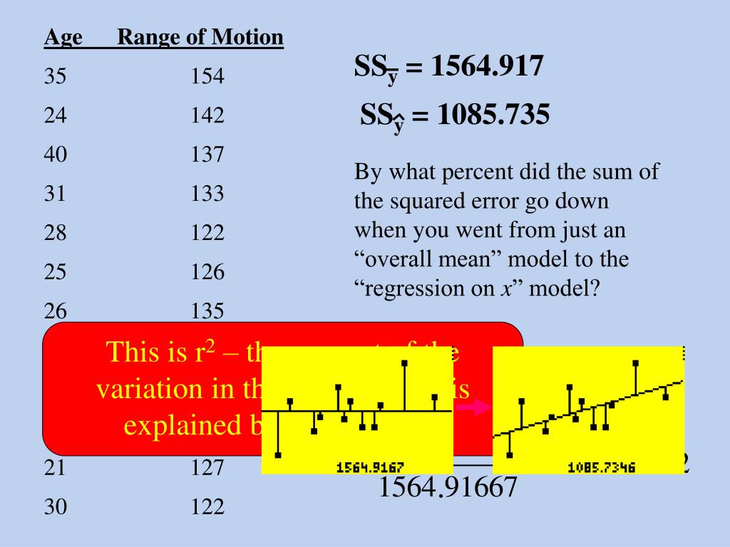 SSy = 1564.917 Age Range of Motion 35 154 24 142 40 137 31 133 28 122 25 126 26 135 16 135 14 108 20 120 21 127 30 122 Let’s examine r2. Suppose you were going to predict a future y but you didn’tknow the x-value. Your best guess would be the overall mean of the existing y’s. Sum of the squared residuals (errors) using the mean of y.