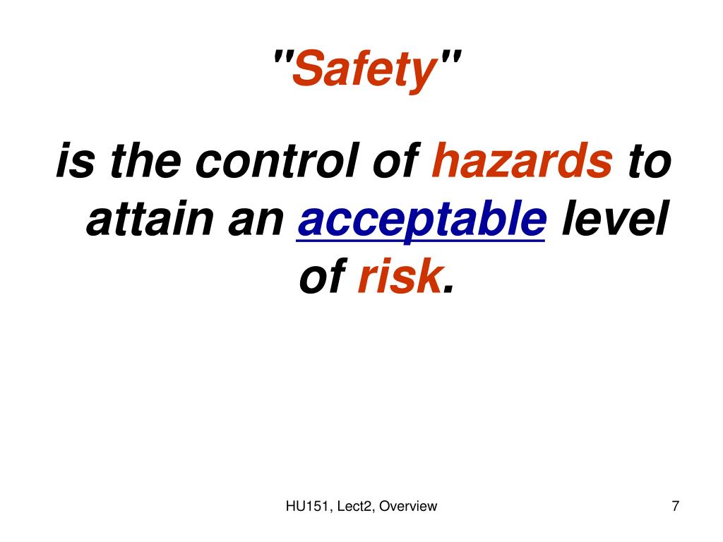 "Safety" is the control of hazards to attain an acceptable level of risk. HU151, Lect2, Overview