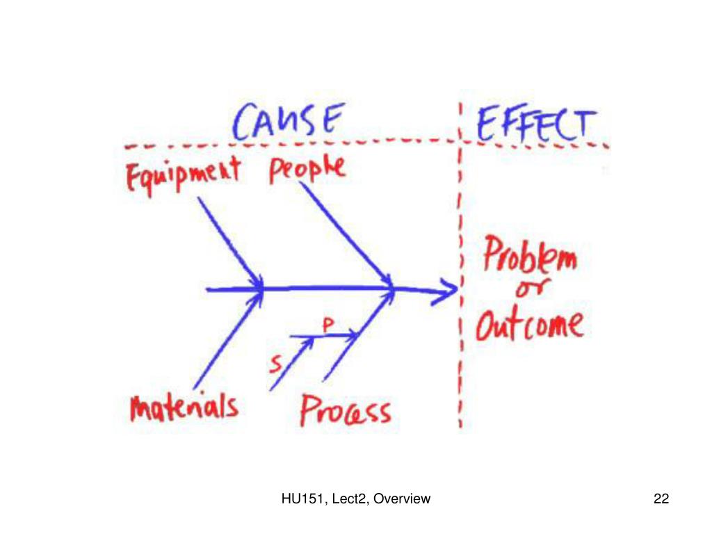 Cause-and-Effect Diagram • The Cause-and-Effect Diagram was created by Dr. Kaoru Ishikawa, an engineer and professor in Japan. • The Cause-and-Effect Diagram is also referred to as a "Fishbone" diagram, getting the name from its resemblance to a fish skeleton when created. • The main purpose of this diagram is to define a problem, identify a possible cause, isolate the cause, and then develop a solution. HU151, Lect2, Overview