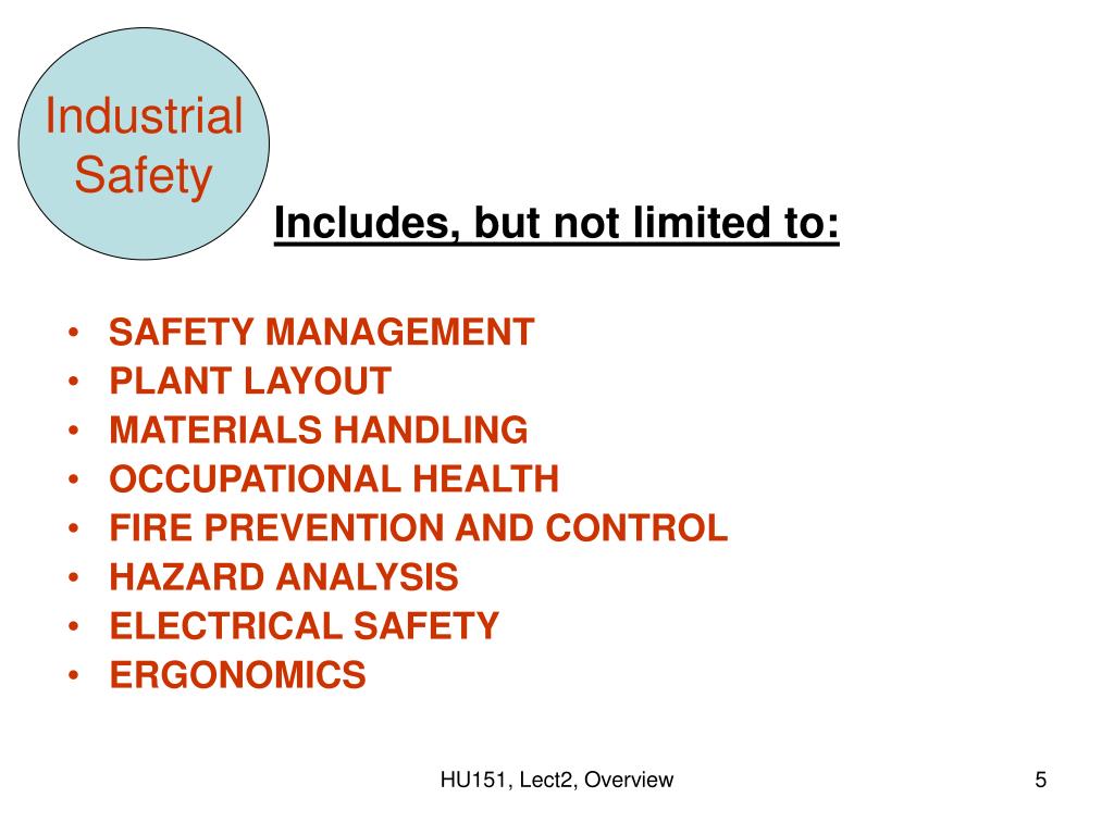 Includes, but not limited to: SAFETY MANAGEMENT PLANT LAYOUT MATERIALS HANDLING OCCUPATIONAL HEALTH FIRE PREVENTION AND CONTROL HAZARD ANALYSIS ELECTRICAL SAFETY ERGONOMICS Industrial Safety HU151, Lect2, Overview