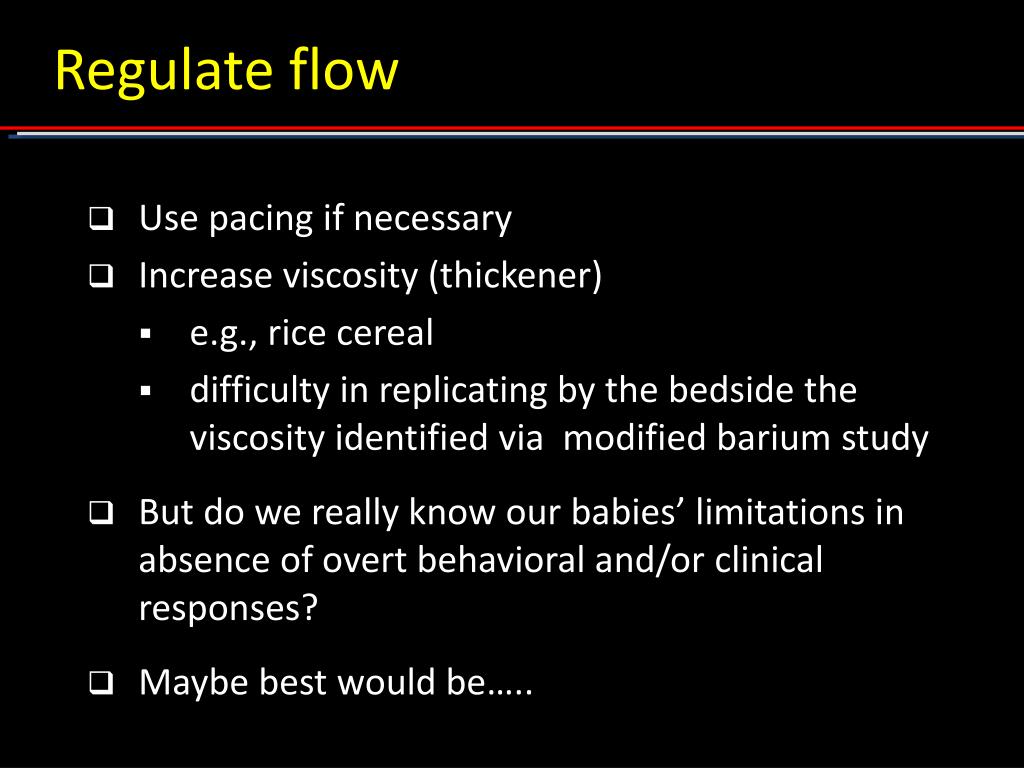 Regulate flow • Use pacing if necessary • Increase viscosity (thickener) • e.g., rice cereal • difficulty in replicating by the bedside the viscosity identified via modified barium study • But do we really know our babies’ limitations in absence of overt behavioral and/or clinical responses? • Maybe best would be…..
