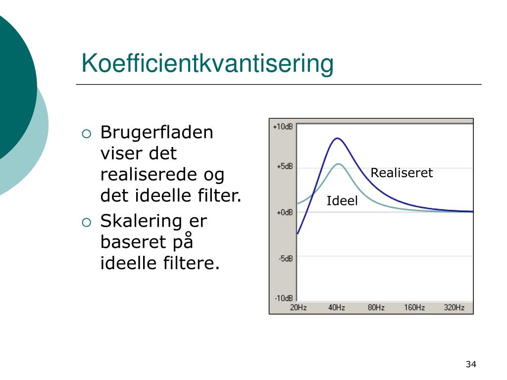 Koefficientkvantisering • Brugerfladen viser det realiserede og det ideelle filter. • Skalering er baseret på ideelle filtere. Realiseret Ideel