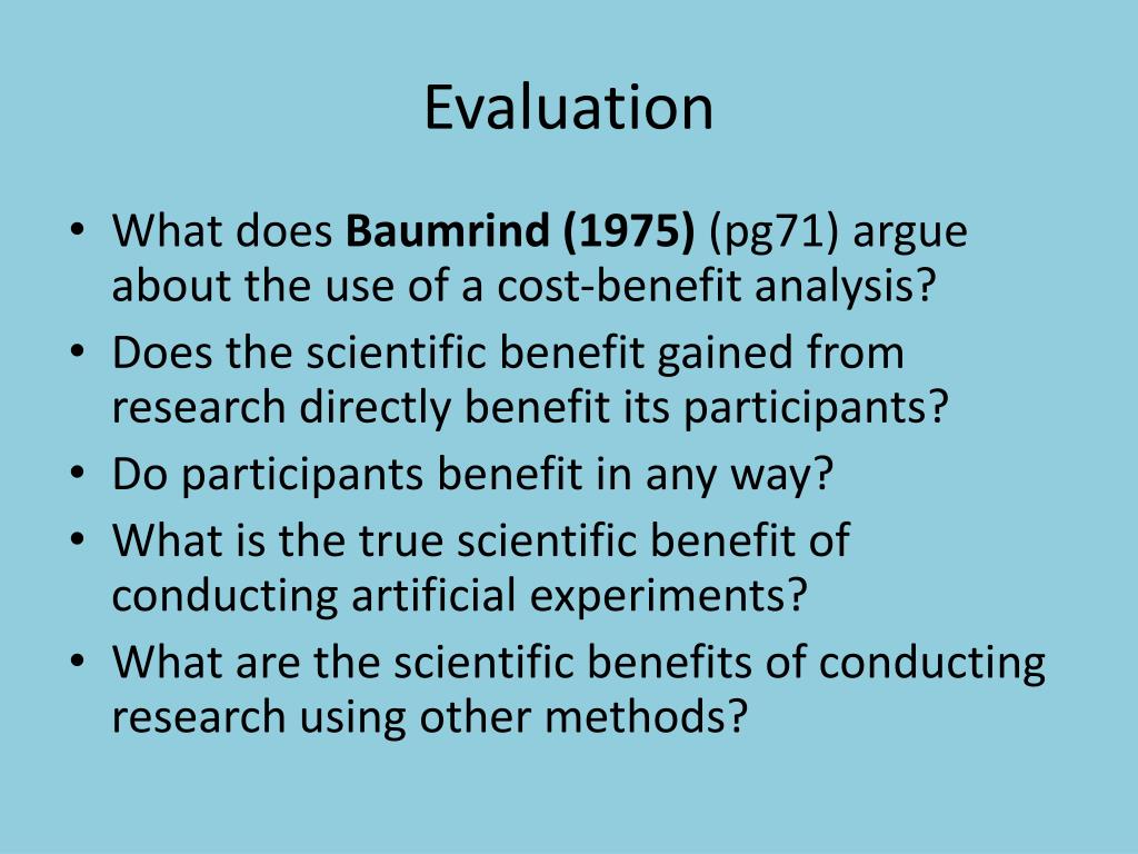 Evaluation • What does Baumrind (1975) (pg71) argue about the use of a cost-benefit analysis? • Does the scientific benefit gained from research directly benefit its participants? • Do participants benefit in any way? • What is the true scientific benefit of conducting artificial experiments? • What are the scientific benefits of conducting research using other methods?