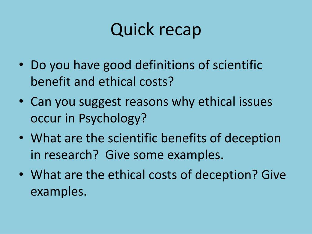Quick recap • Do you have good definitions of scientific benefit and ethical costs? • Can you suggest reasons why ethical issues occur in Psychology? • What are the scientific benefits of deception in research? Give some examples. • What are the ethical costs of deception? Give examples.