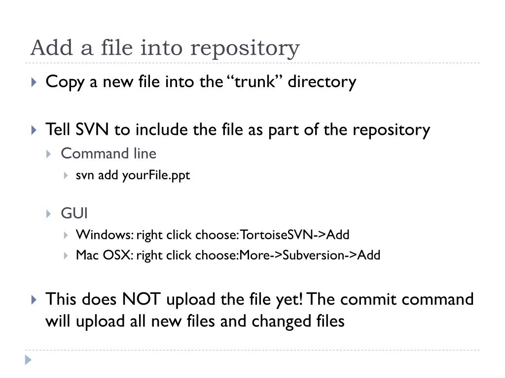 Add a file into repository • Copy a new file into the “trunk” directory • Tell SVN to include the file as part of the repository • Command line • svn add yourFile.ppt • GUI • Windows: right click choose: TortoiseSVN->Add • Mac OSX: right click choose:More->Subversion->Add • This does NOT upload the file yet! The commit command will upload all new files and changed files