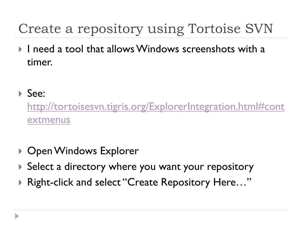 Create a repository using Tortoise SVN • I need a tool that allows Windows screenshots with a timer. • See: http://tortoisesvn.tigris.org/ExplorerIntegration.html#contextmenus • Open Windows Explorer • Select a directory where you want your repository • Right-click and select “Create Repository Here…”