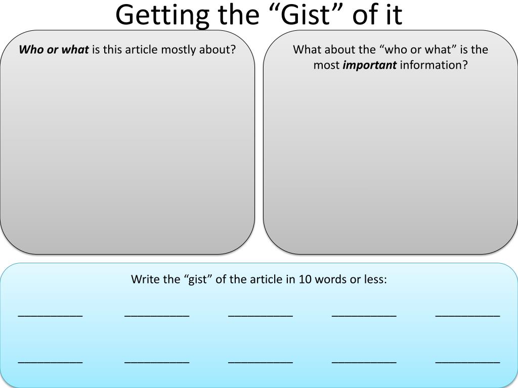 Getting the “Gist” of it Who or what is this article mostly about? What about the “who or what” is the most important information? Write the “gist” of the article in 10 words or less: __________ __________ __________ __________ __________ __________ __________ __________ __________ __________
