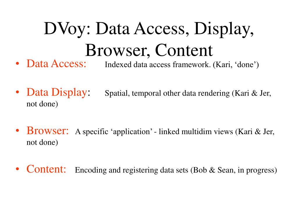 DVoy: Data Access, Display, Browser, Content • Data Access:Indexed data access framework. (Kari, ‘done’) • Data Display: Spatial, temporal other data rendering (Kari & Jer, not done) • Browser:A specific ‘application’ - linked multidim views (Kari & Jer, not done) • Content: Encoding and registering data sets (Bob & Sean, in progress)
