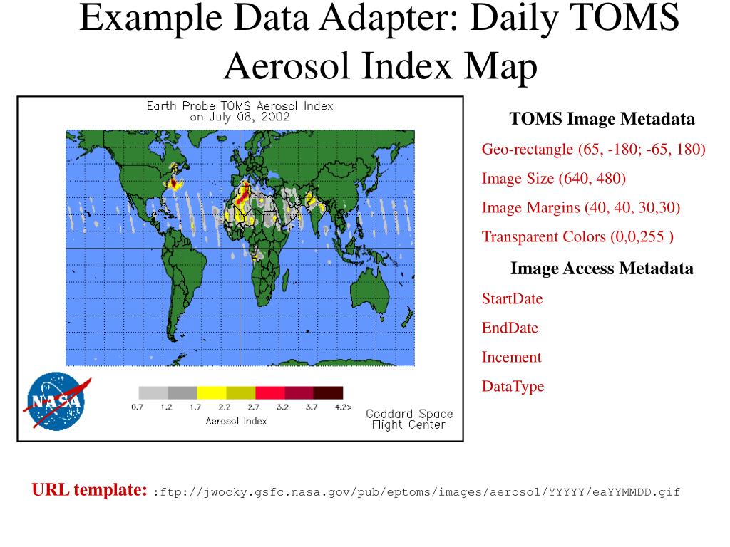 Example Data Adapter: Daily TOMS Aerosol Index Map TOMS Image Metadata Geo-rectangle (65, -180; -65, 180) Image Size (640, 480) Image Margins (40, 40, 30,30) Transparent Colors (0,0,255 ) Image Access Metadata StartDate EndDate Incement DataType URL template: :ftp://jwocky.gsfc.nasa.gov/pub/eptoms/images/aerosol/YYYYY/eaYYMMDD.gif