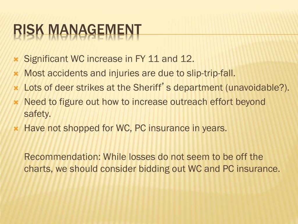 Significant WC increase in FY 11 and 12. Most accidents and injuries are due to slip-trip-fall. Lots of deer strikes at the Sheriff’s department (unavoidable?). Need to figure out how to increase outreach effort beyond safety. Have not shopped for WC, PC insurance in years. Recommendation: While losses do not seem to be off the charts, we should consider bidding out WC and PC insurance. RISK MANAGEMENT