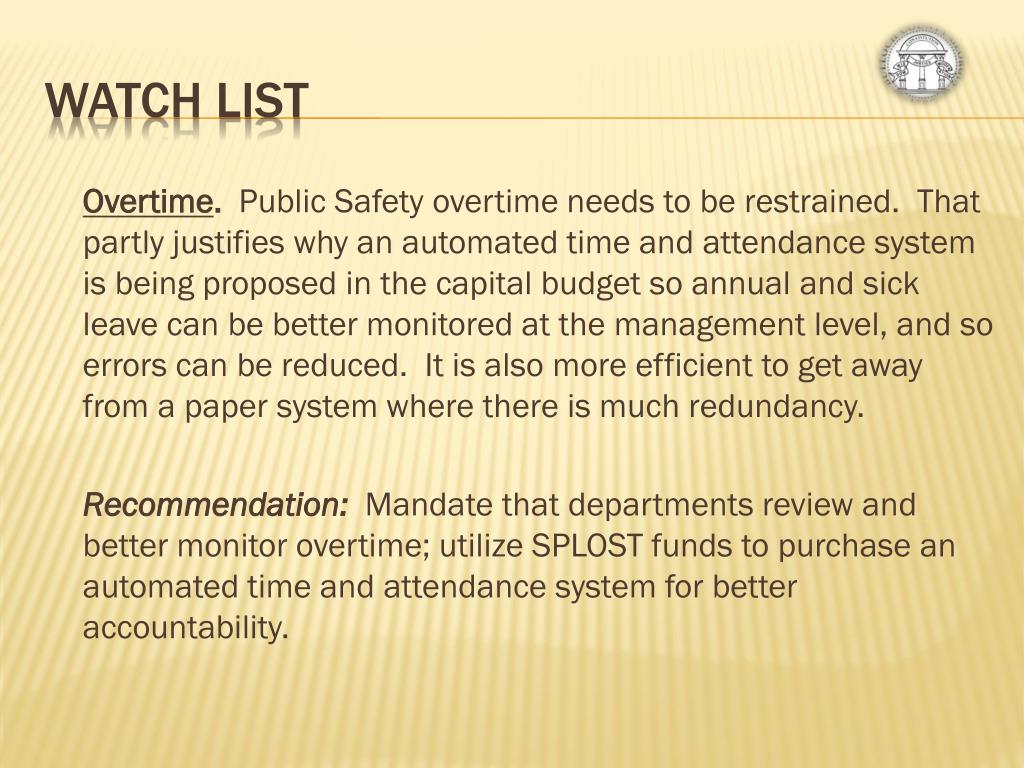 Overtime. Public Safety overtime needs to be restrained. That partly justifies why an automated time and attendance system is being proposed in the capital budget so annual and sick leave can be better monitored at the management level, and so errors can be reduced. It is also more efficient to get away from a paper system where there is much redundancy. Recommendation: Mandate that departments review and better monitor overtime; utilize SPLOST funds to purchase an automated time and attendance system for better accountability. WATCH LIST