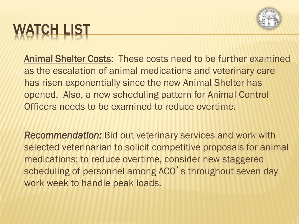Animal Shelter Costs: These costs need to be further examined as the escalation of animal medications and veterinary care has risen exponentially since the new Animal Shelter has opened. Also, a new scheduling pattern for Animal Control Officers needs to be examined to reduce overtime. Recommendation: Bid out veterinary services and work with selected veterinarian to solicit competitive proposals for animal medications; to reduce overtime, consider new staggered scheduling of personnel among ACO’s throughout seven day work week to handle peak loads. WATCH LIST