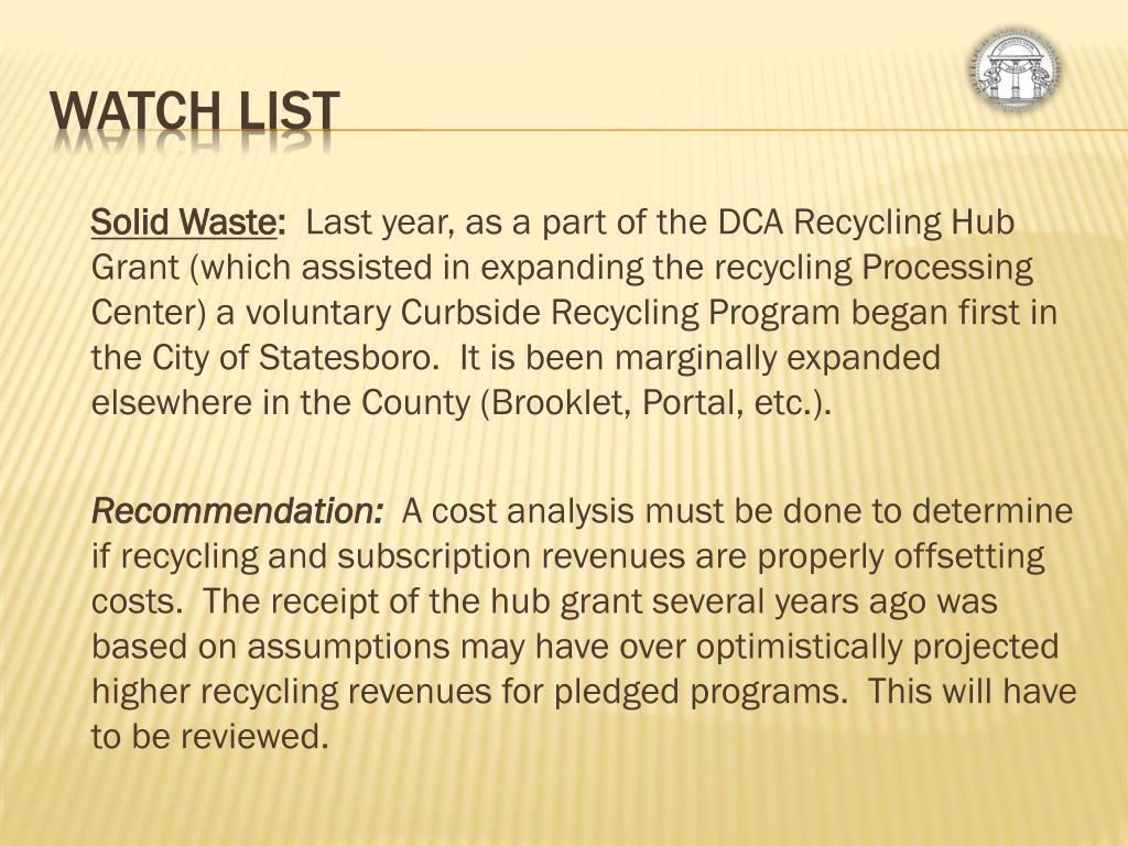 Solid Waste: Last year, as a part of the DCA Recycling Hub Grant (which assisted in expanding the recycling Processing Center) a voluntary Curbside Recycling Program began first in the City of Statesboro. It is been marginally expanded elsewhere in the County (Brooklet, Portal, etc.). Recommendation: A cost analysis must be done to determine if recycling and subscription revenues are properly offsetting costs. The receipt of the hub grant several years ago was based on assumptions may have over optimistically projected higher recycling revenues for pledged programs. This will have to be reviewed. WATCH LIST