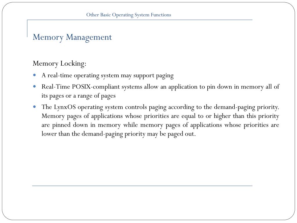 Memory Management Other Basic Operating System Functions Memory Locking: • A real-time operating system may support paging • Real-Time POSIX-compliant systems allow an application to pin down in memory all of its pages or a range of pages • The LynxOS operating system controls paging according to the demand-paging priority. Memory pages of applications whose priorities are equal to or higher than this priority are pinned down in memory while memory pages of applications whose priorities are lower than the demand-paging priority may be paged out.