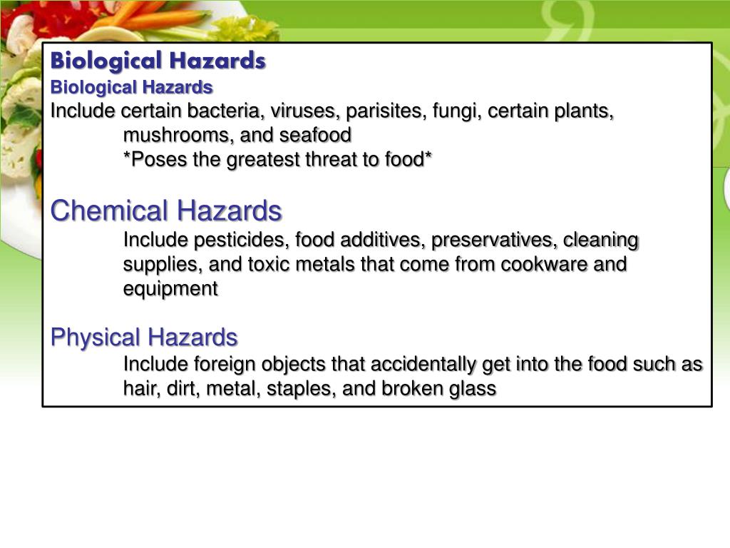 Biological Hazards Biological Hazards Include certain bacteria, viruses, parisites, fungi, certain plants, mushrooms, and seafood *Poses the greatest threat to food* Chemical Hazards Include pesticides, food additives, preservatives, cleaning supplies, and toxic metals that come from cookware and equipment Physical Hazards Include foreign objects that accidentally get into the food such as hair, dirt, metal, staples, and broken glass • Your Description Goes Here Food Safety Hazards