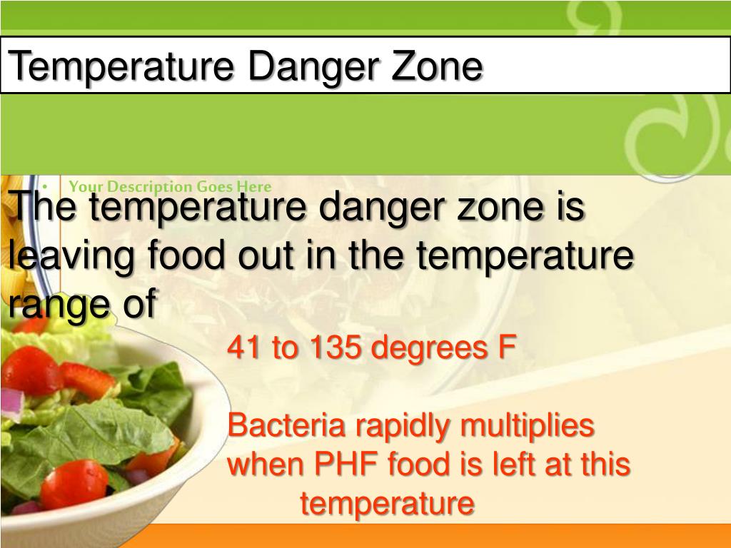 Temperature Danger Zone • Your Description Goes Here The temperature danger zone is leaving food out in the temperature range of 41 to 135 degrees F Bacteria rapidly multiplies when PHF food is left at this temperature