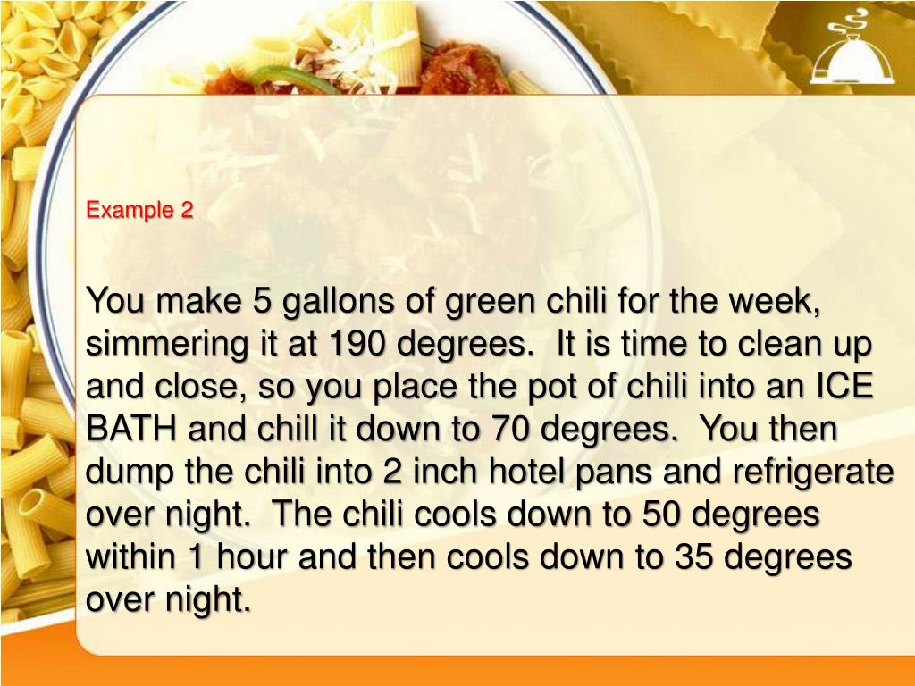 Example 2 You make 5 gallons of green chili for the week, simmering it at 190 degrees. It is time to clean up and close, so you place the pot of chili into an ICE BATH and chill it down to 70 degrees. You then dump the chili into 2 inch hotel pans and refrigerate over night. The chili cools down to 50 degrees within 1 hour and then cools down to 35 degrees over night.