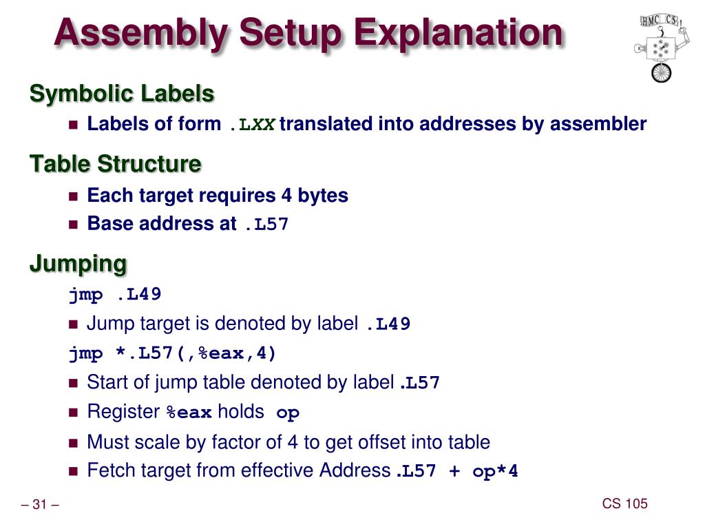 Assembly Setup Explanation Symbolic Labels • Labels of form .LXX translated into addresses by assembler Table Structure • Each target requires 4 bytes • Base address at .L57 Jumping jmp .L49 • Jump target is denoted by label .L49 jmp *.L57(,%eax,4) • Start of jump table denoted by label .L57 • Register %eax holds op • Must scale by factor of 4 to get offset into table • Fetch target from effective Address .L57 + op*4