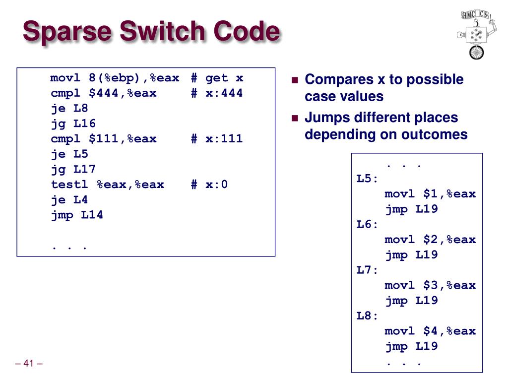 Sparse Switch Code movl 8(%ebp),%eax # get x cmpl $444,%eax # x:444 je L8 jg L16 cmpl $111,%eax # x:111 je L5 jg L17 testl %eax,%eax # x:0 je L4 jmp L14 . . . • Compares x to possible case values • Jumps different places depending on outcomes . . . L5: movl $1,%eax jmp L19 L6: movl $2,%eax jmp L19 L7: movl $3,%eax jmp L19 L8: movl $4,%eax jmp L19 . . .