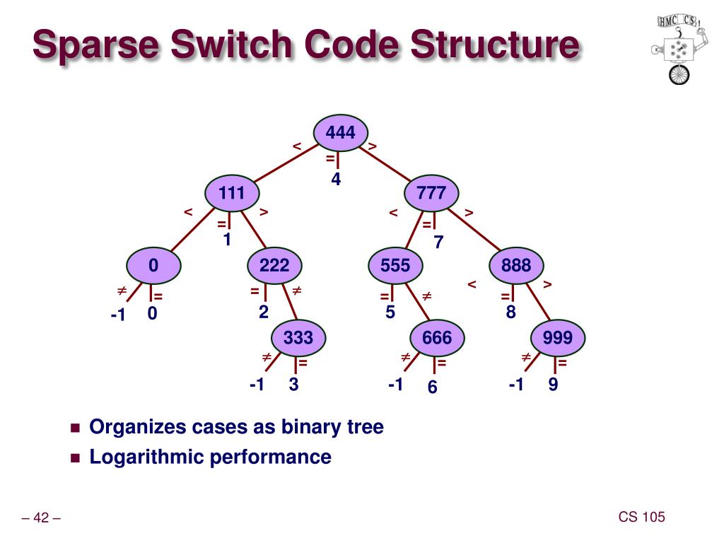 444 111 777 0 222 555 888 -1 -1 -1 -1 333 666 999 Sparse Switch Code Structure • Organizes cases as binary tree • Logarithmic performance < > = 4 < > < > = = 1 7 < > = = = = 2 5 8 0 = = = 3 9 6