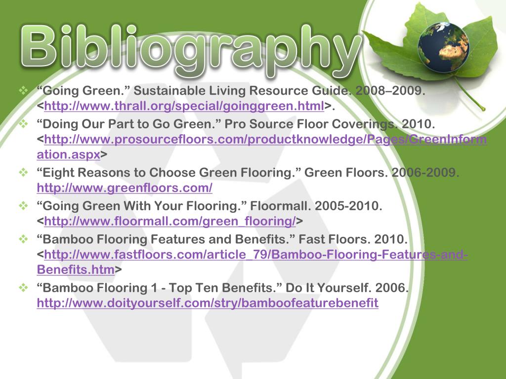 Bibliography • “Going Green.” Sustainable Living Resource Guide. 2008–2009.<http://www.thrall.org/special/goinggreen.html>. • “Doing Our Part to Go Green.” Pro Source Floor Coverings. 2010. <http://www.prosourcefloors.com/productknowledge/Pages/GreenInformation.aspx> • “Eight Reasons to Choose Green Flooring.” Green Floors. 2006-2009.http://www.greenfloors.com/ • “Going Green With Your Flooring.” Floormall. 2005-2010.<http://www.floormall.com/green_flooring/> • “Bamboo Flooring Features and Benefits.” Fast Floors. 2010.<http://www.fastfloors.com/article_79/Bamboo-Flooring-Features-and-Benefits.htm> • “Bamboo Flooring 1 - Top Ten Benefits.” Do It Yourself. 2006. http://www.doityourself.com/stry/bamboofeaturebenefit