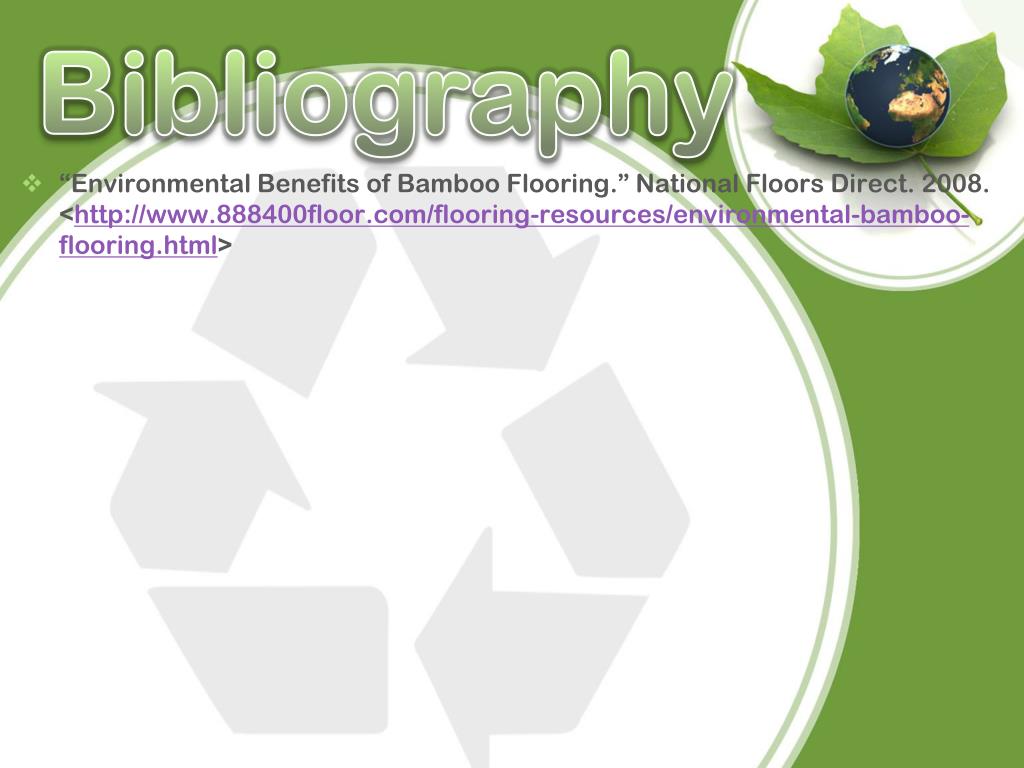 Bibliography • “Environmental Benefits of Bamboo Flooring.” National Floors Direct. 2008.<http://www.888400floor.com/flooring-resources/environmental-bamboo-flooring.html>