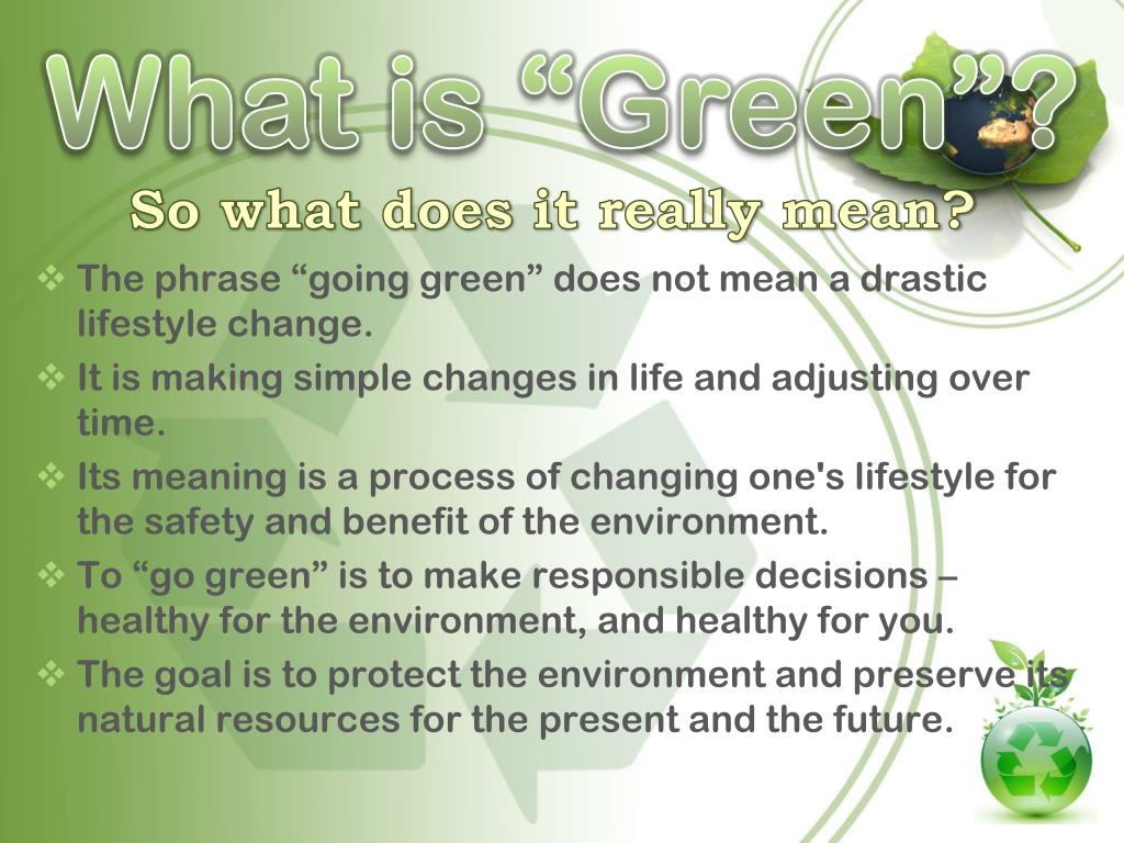 What is “Green”? So what does it really mean? • The phrase “going green” does not mean a drastic lifestyle change. • It is making simple changes in life and adjusting over time. • Its meaning is a process of changing one's lifestyle for the safety and benefit of the environment. • To “go green” is to make responsible decisions – healthy for the environment, and healthy for you. • The goal is to protect the environment and preserve its natural resources for the present and the future.