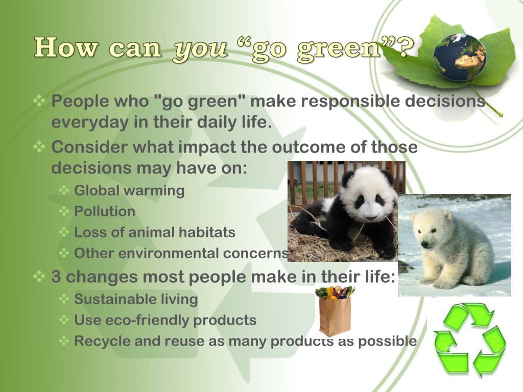 How can you “go green”? • People who "go green" make responsible decisions everyday in their daily life. • Consider what impact the outcome of those decisions may have on: • Global warming • Pollution • Loss of animal habitats • Other environmental concerns • 3 changes most people make in their life: • Sustainable living • Use eco-friendly products • Recycle and reuse as many products as possible