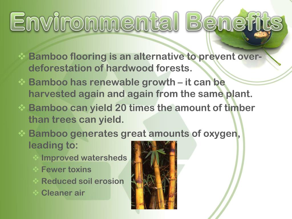 Environmental Benefits • Bamboo flooring is an alternative to prevent over-deforestation of hardwood forests. • Bamboo has renewable growth – it can be harvested again and again from the same plant. • Bamboo can yield 20 times the amount of timber than trees can yield. • Bamboo generates great amounts of oxygen, leading to: • Improved watersheds • Fewer toxins • Reduced soil erosion • Cleaner air