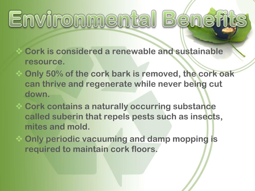 Environmental Benefits • Cork is considered a renewable and sustainable resource. • Only 50% of the cork bark is removed, the cork oak can thrive and regenerate while never being cut down. • Cork contains a naturally occurring substance called suberin that repels pests such as insects, mites and mold. • Only periodic vacuuming and damp mopping is required to maintain cork floors.