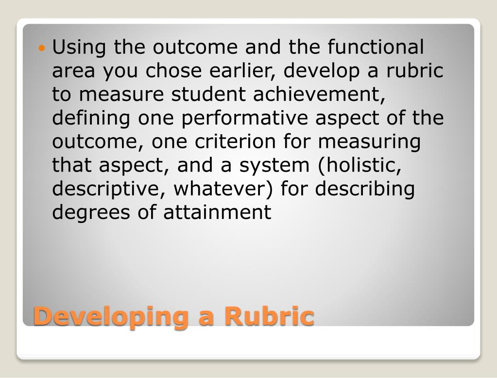 Using the outcome and the functional area you chose earlier, develop a rubric to measure student achievement, defining one performative aspect of the outcome, one criterion for measuring that aspect, and a system (holistic, descriptive, whatever) for describing degrees of attainment Developing a Rubric