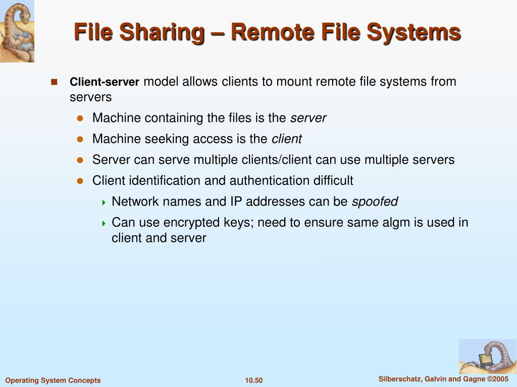 File Sharing – Remote File Systems • Client-server model allows clients to mount remote file systems from servers • Machine containing the files is the server • Machine seeking access is the client • Server can serve multiple clients/client can use multiple servers • Client identification and authentication difficult • Network names and IP addresses can be spoofed • Can use encrypted keys; need to ensure same algm is used in client and server