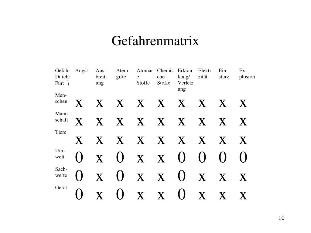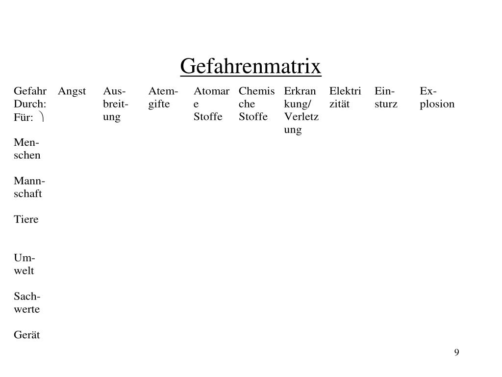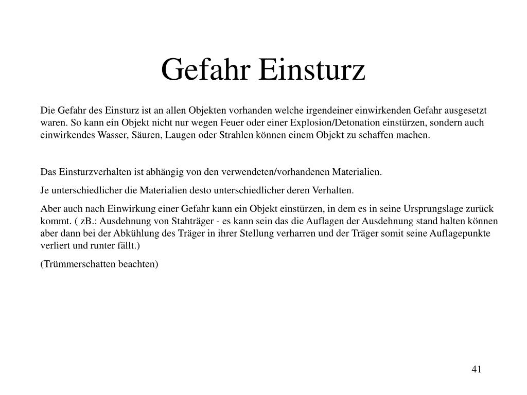Gefahr Einsturz Die Gefahr des Einsturz ist an allen Objekten vorhanden welche irgendeiner einwirkenden Gefahr ausgesetzt waren. So kann ein Objekt nicht nur wegen Feuer oder einer Explosion/Detonation einstürzen, sondern auch einwirkendes Wasser, Säuren, Laugen oder Strahlen können einem Objekt zu schaffen machen. Das Einsturzverhalten ist abhängig von den verwendeten/vorhandenen Materialien. Je unterschiedlicher die Materialien desto unterschiedlicher deren Verhalten. Aber auch nach Einwirkung einer Gefahr kann ein Objekt einstürzen, in dem es in seine Ursprungslage zurück kommt. ( zB.: Ausdehnung von Stahträger - es kann sein das die Auflagen der Ausdehnung stand halten können aber dann bei der Abkühlung des Träger in ihrer Stellung verharren und der Träger somit seine Auflagepunkte verliert und runter fällt.) (Trümmerschatten beachten)