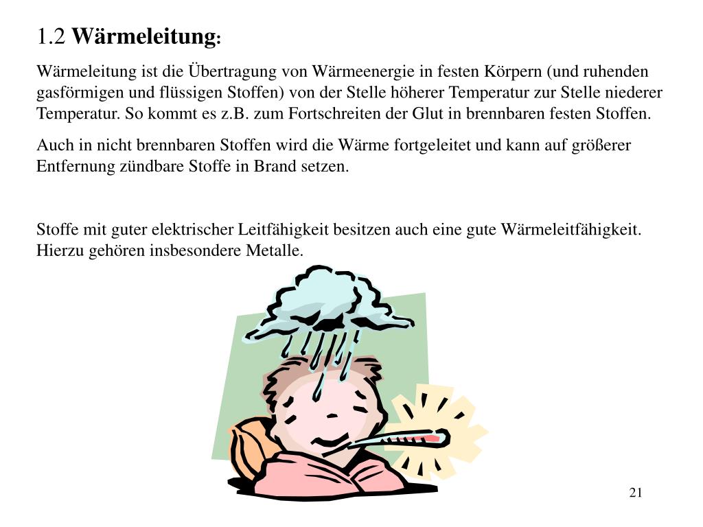 1.2 Wärmeleitung: Wärmeleitung ist die Übertragung von Wärmeenergie in festen Körpern (und ruhenden gasförmigen und flüssigen Stoffen) von der Stelle höherer Temperatur zur Stelle niederer Temperatur. So kommt es z.B. zum Fortschreiten der Glut in brennbaren festen Stoffen. Auch in nicht brennbaren Stoffen wird die Wärme fortgeleitet und kann auf größerer Entfernung zündbare Stoffe in Brand setzen. Stoffe mit guter elektrischer Leitfähigkeit besitzen auch eine gute Wärmeleitfähigkeit. Hierzu gehören insbesondere Metalle.