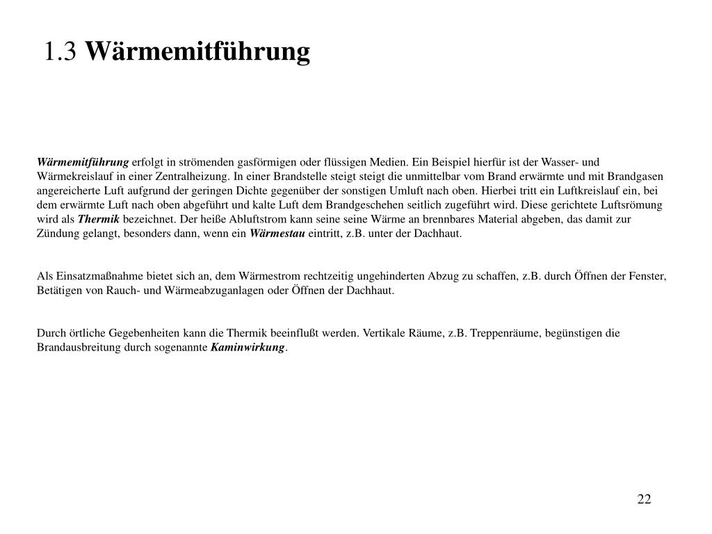 Wärmemitführung erfolgt in strömenden gasförmigen oder flüssigen Medien. Ein Beispiel hierfür ist der Wasser- und Wärmekreislauf in einer Zentralheizung. In einer Brandstelle steigt steigt die unmittelbar vom Brand erwärmte und mit Brandgasen angereicherte Luft aufgrund der geringen Dichte gegenüber der sonstigen Umluft nach oben. Hierbei tritt ein Luftkreislauf ein, bei dem erwärmte Luft nach oben abgeführt und kalte Luft dem Brandgeschehen seitlich zugeführt wird. Diese gerichtete Luftsrömung wird als Thermikbezeichnet. Der heiße Abluftstrom kann seine seine Wärme an brennbares Material abgeben, das damit zur Zündung gelangt, besonders dann, wenn ein Wärmestau eintritt, z.B. unter der Dachhaut. Als Einsatzmaßnahme bietet sich an, dem Wärmestrom rechtzeitig ungehinderten Abzug zu schaffen, z.B. durch Öffnen der Fenster, Betätigen von Rauch- und Wärmeabzuganlagen oder Öffnen der Dachhaut. Durch örtliche Gegebenheiten kann die Thermik beeinflußt werden. Vertikale Räume, z.B. Treppenräume, begünstigen die Brandausbreitung durch sogenannte Kaminwirkung. 1.3 Wärmemitführung