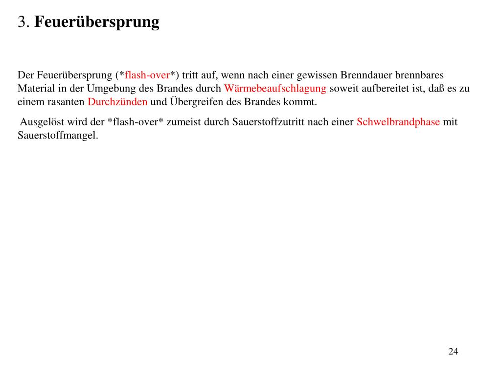 3. Feuerübersprung Der Feuerübersprung (*flash-over*) tritt auf, wenn nach einer gewissen Brenndauer brennbares Material in der Umgebung des Brandes durch Wärmebeaufschlagung soweit aufbereitet ist, daß es zu einem rasanten Durchzünden und Übergreifen des Brandes kommt. Ausgelöst wird der *flash-over* zumeist durch Sauerstoffzutritt nach einer Schwelbrandphase mit Sauerstoffmangel.