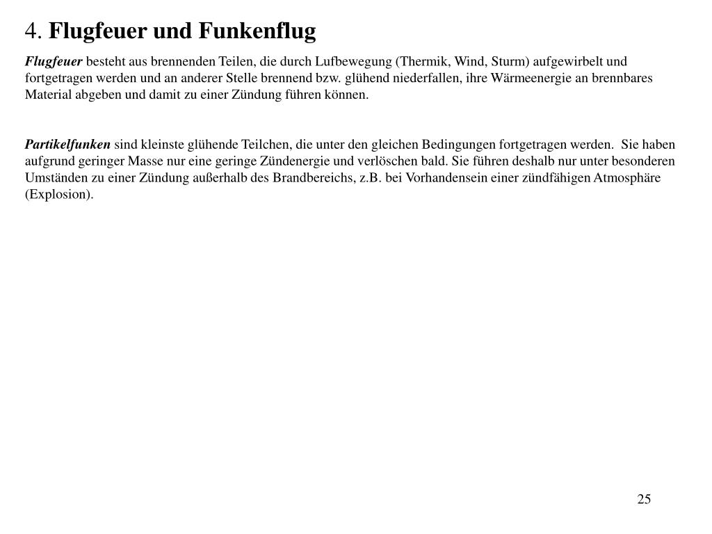 4. Flugfeuer und Funkenflug Flugfeuer besteht aus brennenden Teilen, die durch Lufbewegung (Thermik, Wind, Sturm) aufgewirbelt und fortgetragen werden und an anderer Stelle brennend bzw. glühend niederfallen, ihre Wärmeenergie an brennbares Material abgeben und damit zu einer Zündung führen können. Partikelfunken sind kleinste glühende Teilchen, die unter den gleichen Bedingungen fortgetragen werden. Sie haben aufgrund geringer Masse nur eine geringe Zündenergie und verlöschen bald. Sie führen deshalb nur unter besonderen Umständen zu einer Zündung außerhalb des Brandbereichs, z.B. bei Vorhandensein einer zündfähigen Atmosphäre (Explosion).