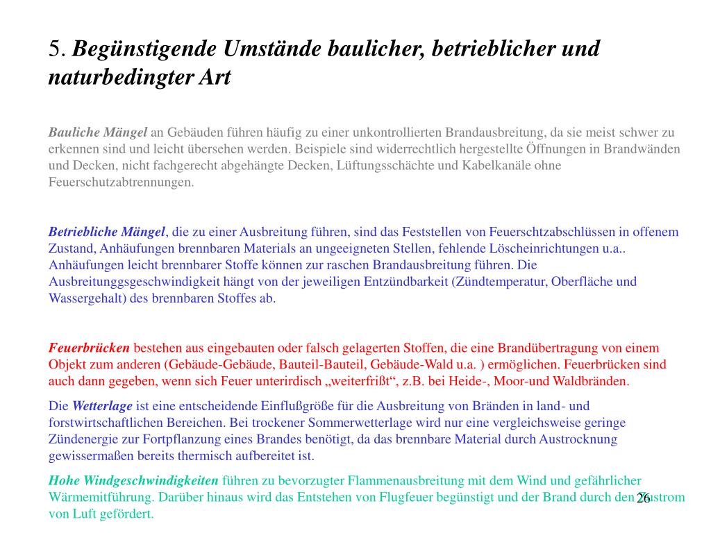 5. Begünstigende Umstände baulicher, betrieblicher und naturbedingter Art Bauliche Mängel an Gebäuden führen häufig zu einer unkontrollierten Brandausbreitung, da sie meist schwer zu erkennen sind und leicht übersehen werden. Beispiele sind widerrechtlich hergestellte Öffnungen in Brandwänden und Decken, nicht fachgerecht abgehängte Decken, Lüftungsschächte und Kabelkanäle ohne Feuerschutzabtrennungen. Betriebliche Mängel, die zu einer Ausbreitung führen, sind das Feststellen von Feuerschtzabschlüssen in offenem Zustand, Anhäufungen brennbaren Materials an ungeeigneten Stellen, fehlende Löscheinrichtungen u.a.. Anhäufungen leicht brennbarer Stoffe können zur raschen Brandausbreitung führen. Die Ausbreitunggsgeschwindigkeit hängt von der jeweiligen Entzündbarkeit (Zündtemperatur, Oberfläche und Wassergehalt) des brennbaren Stoffes ab. Feuerbrücken bestehen aus eingebauten oder falsch gelagerten Stoffen, die eine Brandübertragung von einem Objekt zum anderen (Gebäude-Gebäude, Bauteil-Bauteil, Gebäude-Wald u.a. ) ermöglichen. Feuerbrücken sind auch dann gegeben, wenn sich Feuer unterirdisch „weiterfrißt“, z.B. bei Heide-, Moor-und Waldbränden. Die Wetterlage ist eine entscheidende Einflußgröße für die Ausbreitung von Bränden in land- und forstwirtschaftlichen Bereichen. Bei trockener Sommerwetterlage wird nur eine vergleichsweise geringe Zündenergie zur Fortpflanzung eines Brandes benötigt, da das brennbare Material durch Austrocknung gewissermaßen bereits thermisch aufbereitet ist. Hohe Windgeschwindigkeiten führen zu bevorzugter Flammenausbreitung mit dem Wind und gefährlicher Wärmemitführung. Darüber hinaus wird das Entstehen von Flugfeuer begünstigt und der Brand durch den Zustrom von Luft gefördert.