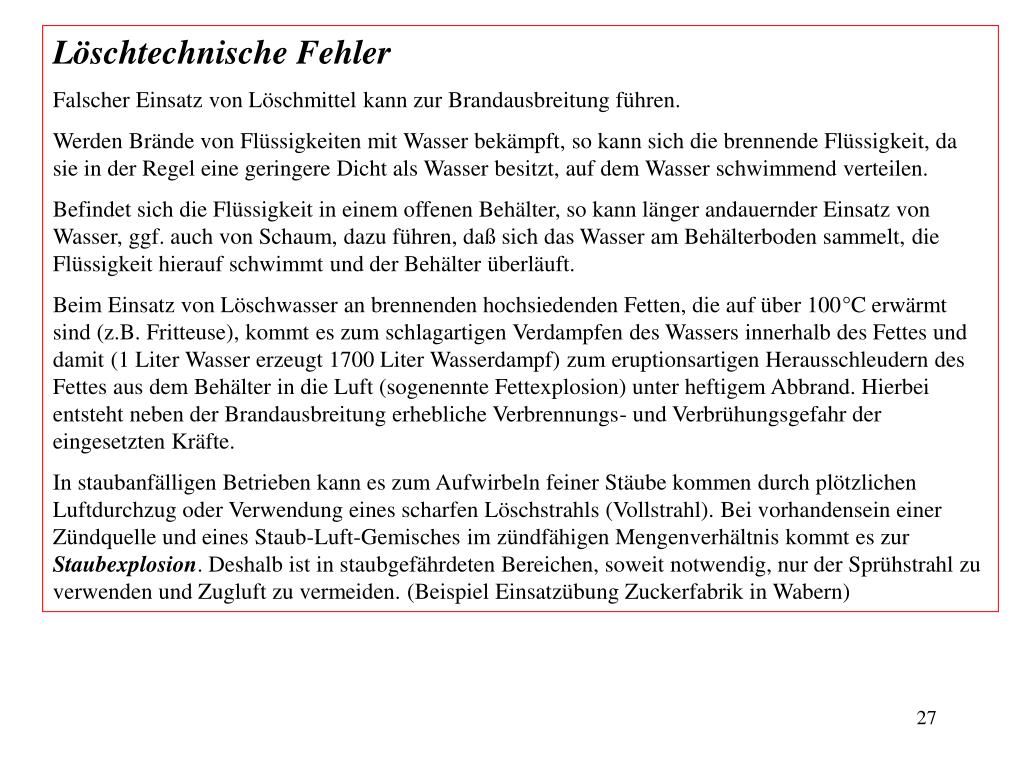 Löschtechnische Fehler Falscher Einsatz von Löschmittel kann zur Brandausbreitung führen. Werden Brände von Flüssigkeiten mit Wasser bekämpft, so kann sich die brennende Flüssigkeit, da sie in der Regel eine geringere Dicht als Wasser besitzt, auf dem Wasser schwimmend verteilen. Befindet sich die Flüssigkeit in einem offenen Behälter, so kann länger andauernder Einsatz von Wasser, ggf. auch von Schaum, dazu führen, daß sich das Wasser am Behälterboden sammelt, die Flüssigkeit hierauf schwimmt und der Behälter überläuft. Beim Einsatz von Löschwasser an brennenden hochsiedenden Fetten, die auf über 100°C erwärmt sind (z.B. Fritteuse), kommt es zum schlagartigen Verdampfen des Wassers innerhalb des Fettes und damit (1 Liter Wasser erzeugt 1700 Liter Wasserdampf) zum eruptionsartigen Herausschleudern des Fettes aus dem Behälter in die Luft (sogenennte Fettexplosion) unter heftigem Abbrand. Hierbei entsteht neben der Brandausbreitung erhebliche Verbrennungs- und Verbrühungsgefahr der eingesetzten Kräfte. In staubanfälligen Betrieben kann es zum Aufwirbeln feiner Stäube kommen durch plötzlichen Luftdurchzug oder Verwendung eines scharfen Löschstrahls (Vollstrahl). Bei vorhandensein einer Zündquelle und eines Staub-Luft-Gemisches im zündfähigen Mengenverhältnis kommt es zur Staubexplosion. Deshalb ist in staubgefährdeten Bereichen, soweit notwendig, nur der Sprühstrahl zu verwenden und Zugluft zu vermeiden. (Beispiel Einsatzübung Zuckerfabrik in Wabern)
