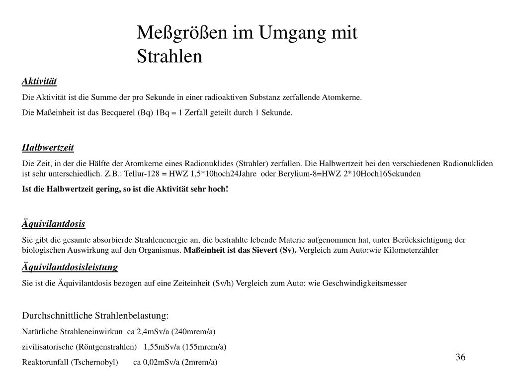 Meßgrößen im Umgang mit Strahlen Aktivität Die Aktivität ist die Summe der pro Sekunde in einer radioaktiven Substanz zerfallende Atomkerne. Die Maßeinheit ist das Becquerel (Bq) 1Bq = 1 Zerfall geteilt durch 1 Sekunde. Halbwertzeit Die Zeit, in der die Hälfte der Atomkerne eines Radionuklides (Strahler) zerfallen. Die Halbwertzeit bei den verschiedenen Radionukliden ist sehr unterschiedlich. Z.B.: Tellur-128 = HWZ 1,5*10hoch24Jahre oder Berylium-8=HWZ 2*10Hoch16Sekunden Ist die Halbwertzeit gering, so ist die Aktivität sehr hoch! Äquivilantdosis Sie gibt die gesamte absorbierde Strahlenenergie an, die bestrahlte lebende Materie aufgenommen hat, unter Berücksichtigung der biologischen Auswirkung auf den Organismus. Maßeinheit ist das Sievert (Sv). Vergleich zum Auto:wie Kilometerzähler Äquivilantdosisleistung Sie ist die Äquivilantdosis bezogen auf eine Zeiteinheit (Sv/h) Vergleich zum Auto: wie Geschwindigkeitsmesser Durchschnittliche Strahlenbelastung: Natürliche Strahleneinwirkun ca 2,4mSv/a (240mrem/a) zivilisatorische (Röntgenstrahlen) 1,55mSv/a (155mrem/a) Reaktorunfall (Tschernobyl) ca 0,02mSv/a (2mrem/a)
