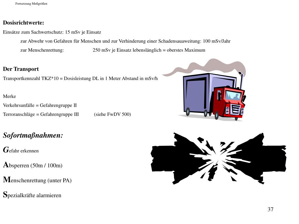 Fortsetzung Meßgrößen Dosisrichtwerte: Einsätze zum Sachwertschutz: 15 mSv je Einsatz zur Abwehr von Gefahren für Menschen und zur Verhinderung einer Schadensauaweitung: 100 mSv/Jahr zur Menschenrettung: 250 mSv je Einsatz lebenslänglich = oberstes Maximum Der Transport Transportkennzahl TKZ*10 = Dosisleistung DL in 1 Meter Abstand in mSv/h Merke Verkehrsunfälle = Gefahrengruppe II Terroranschläge = Gefahrengruppe III (siehe FwDV 500) Sofortmaßnahmen: Gefahr erkennen Absperren (50m / 100m) Menschenrettung (unter PA) Spezialkräfte alarmieren