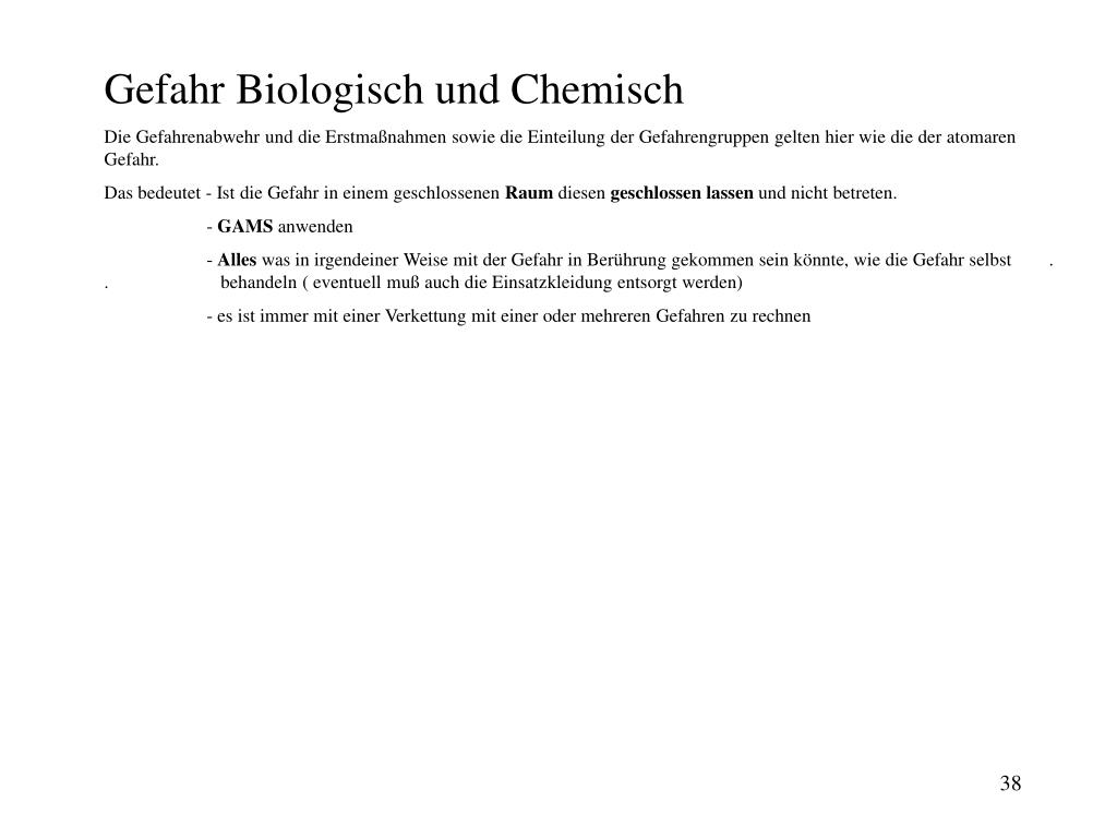 Gefahr Biologisch und Chemisch Die Gefahrenabwehr und die Erstmaßnahmen sowie die Einteilung der Gefahrengruppen gelten hier wie die der atomaren Gefahr. Das bedeutet - Ist die Gefahr in einem geschlossenen Raum diesen geschlossen lassen und nicht betreten. - GAMS anwenden - Alles was in irgendeiner Weise mit der Gefahr in Berührung gekommen sein könnte, wie die Gefahr selbst . . behandeln ( eventuell muß auch die Einsatzkleidung entsorgt werden) - es ist immer mit einer Verkettung mit einer oder mehreren Gefahren zu rechnen