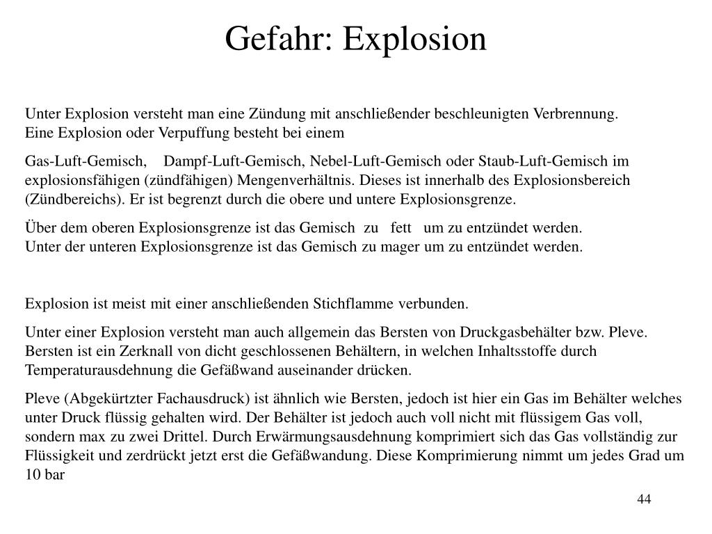 Gefahr: Explosion Unter Explosion versteht man eine Zündung mit anschließender beschleunigten Verbrennung. Eine Explosion oder Verpuffung besteht bei einem Gas-Luft-Gemisch, Dampf-Luft-Gemisch, Nebel-Luft-Gemisch oder Staub-Luft-Gemisch im explosionsfähigen (zündfähigen) Mengenverhältnis. Dieses ist innerhalb des Explosionsbereich (Zündbereichs). Er ist begrenzt durch die obere und untere Explosionsgrenze. Über dem oberen Explosionsgrenze ist das Gemisch zu fett um zu entzündet werden. Unter der unteren Explosionsgrenze ist das Gemisch zu mager um zu entzündet werden. Explosion ist meist mit einer anschließenden Stichflamme verbunden. Unter einer Explosion versteht man auch allgemein das Bersten von Druckgasbehälter bzw. Pleve. Bersten ist ein Zerknall von dicht geschlossenen Behältern, in welchen Inhaltsstoffe durch Temperaturausdehnung die Gefäßwand auseinander drücken. Pleve (Abgekürtzter Fachausdruck) ist ähnlich wie Bersten, jedoch ist hier ein Gas im Behälter welches unter Druck flüssig gehalten wird. Der Behälter ist jedoch auch voll nicht mit flüssigem Gas voll, sondern max zu zwei Drittel. Durch Erwärmungsausdehnung komprimiert sich das Gas vollständig zur Flüssigkeit und zerdrückt jetzt erst die Gefäßwandung. Diese Komprimierung nimmt um jedes Grad um 10 bar