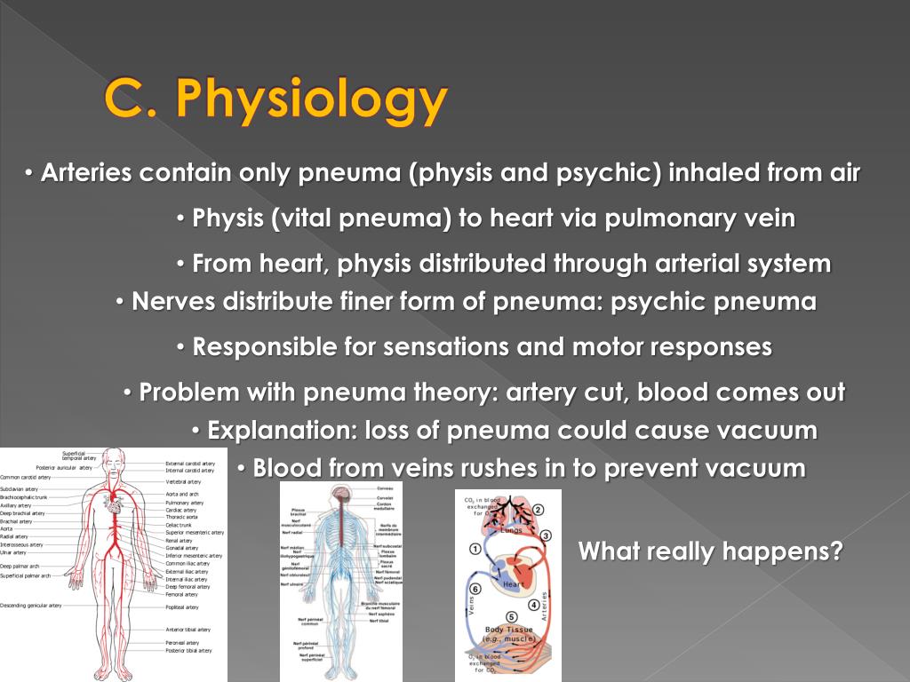 C. Physiology • Arteries contain only pneuma (physis and psychic) inhaled from air • Physis (vital pneuma) to heart via pulmonary vein • From heart, physis distributed through arterial system • Nerves distribute finer form of pneuma: psychic pneuma • Responsible for sensations and motor responses • Problem with pneuma theory: artery cut, blood comes out • Explanation: loss of pneuma could cause vacuum • Blood from veins rushes in to prevent vacuum What really happens?