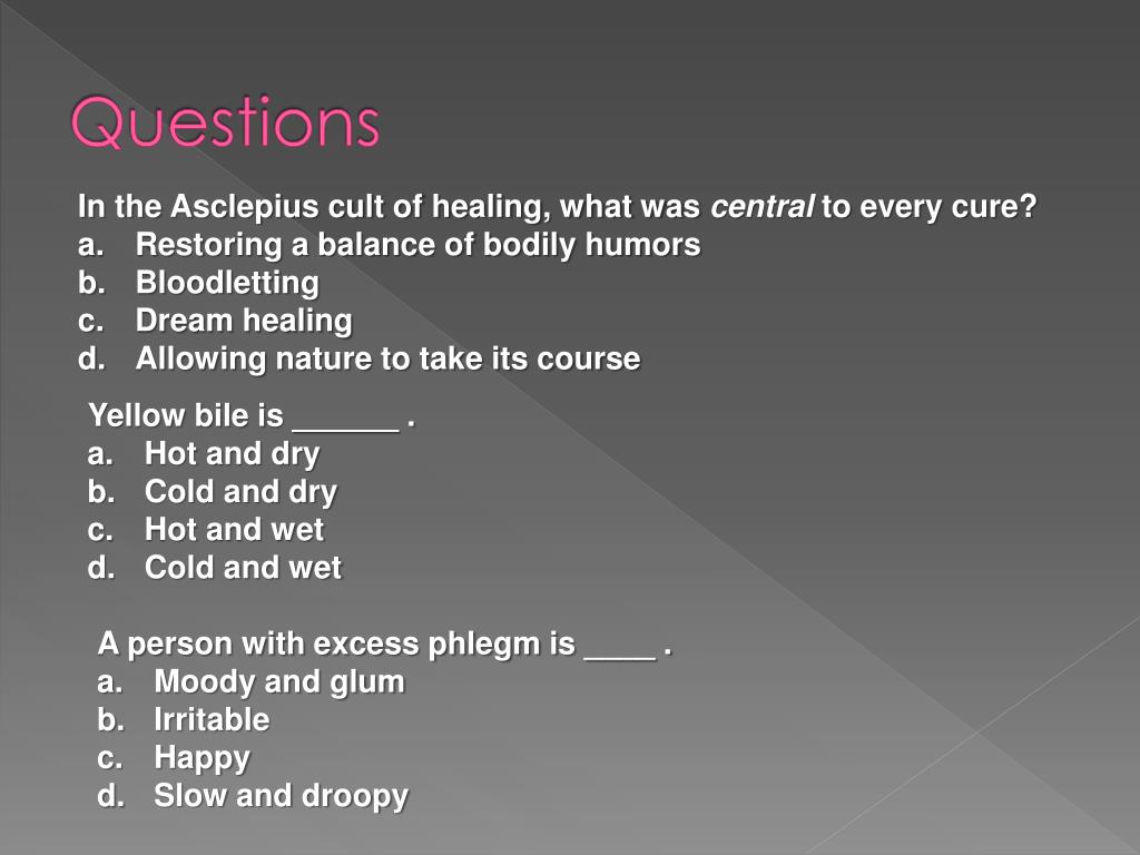 Questions • In the Asclepius cult of healing, what was central to every cure? • Restoring a balance of bodily humors • Bloodletting • Dream healing • Allowing nature to take its course • Yellow bile is ______ . • Hot and dry • Cold and dry • Hot and wet • Cold and wet • A person with excess phlegm is ____ . • Moody and glum • Irritable • Happy • Slow and droopy